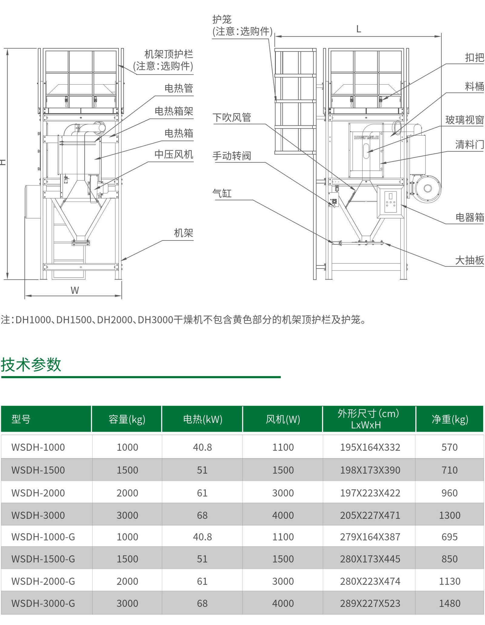 注:干燥机容量以装载尼龙6颗粒状原料的质量为标准;电源:3Φ 380VAC 50Hz;